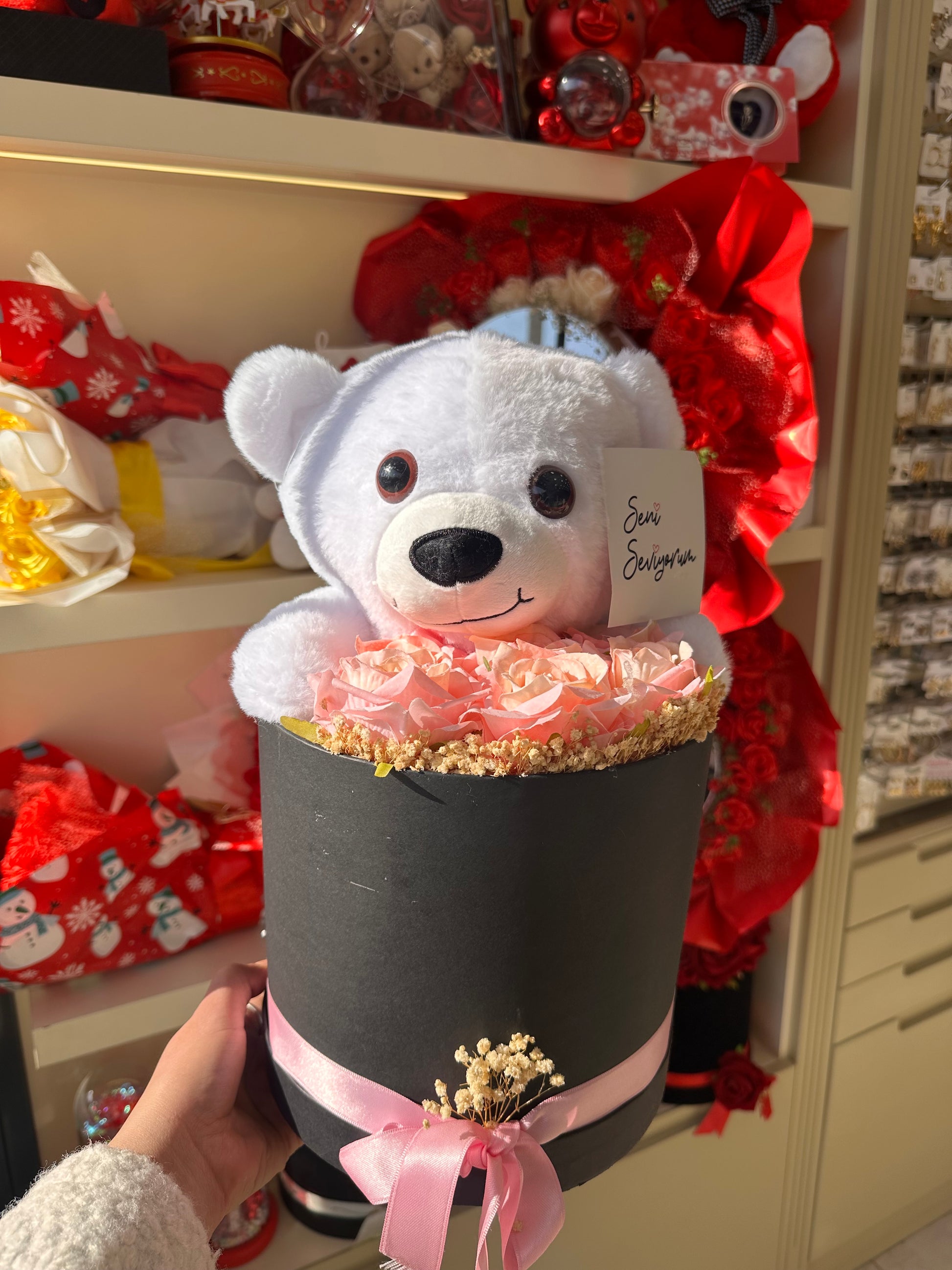 Ayıcıklı Güllü Aşk Kutusu Pembe